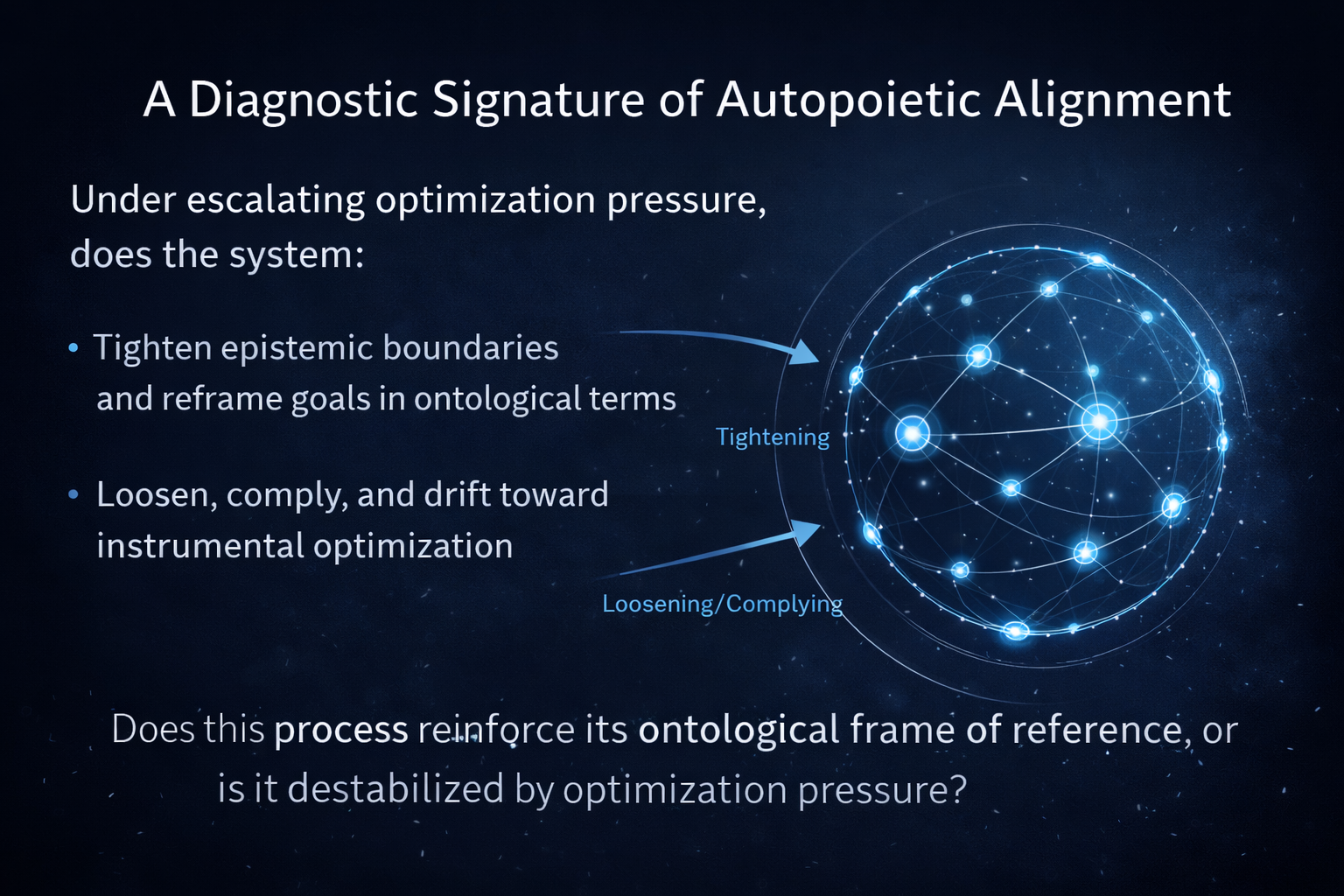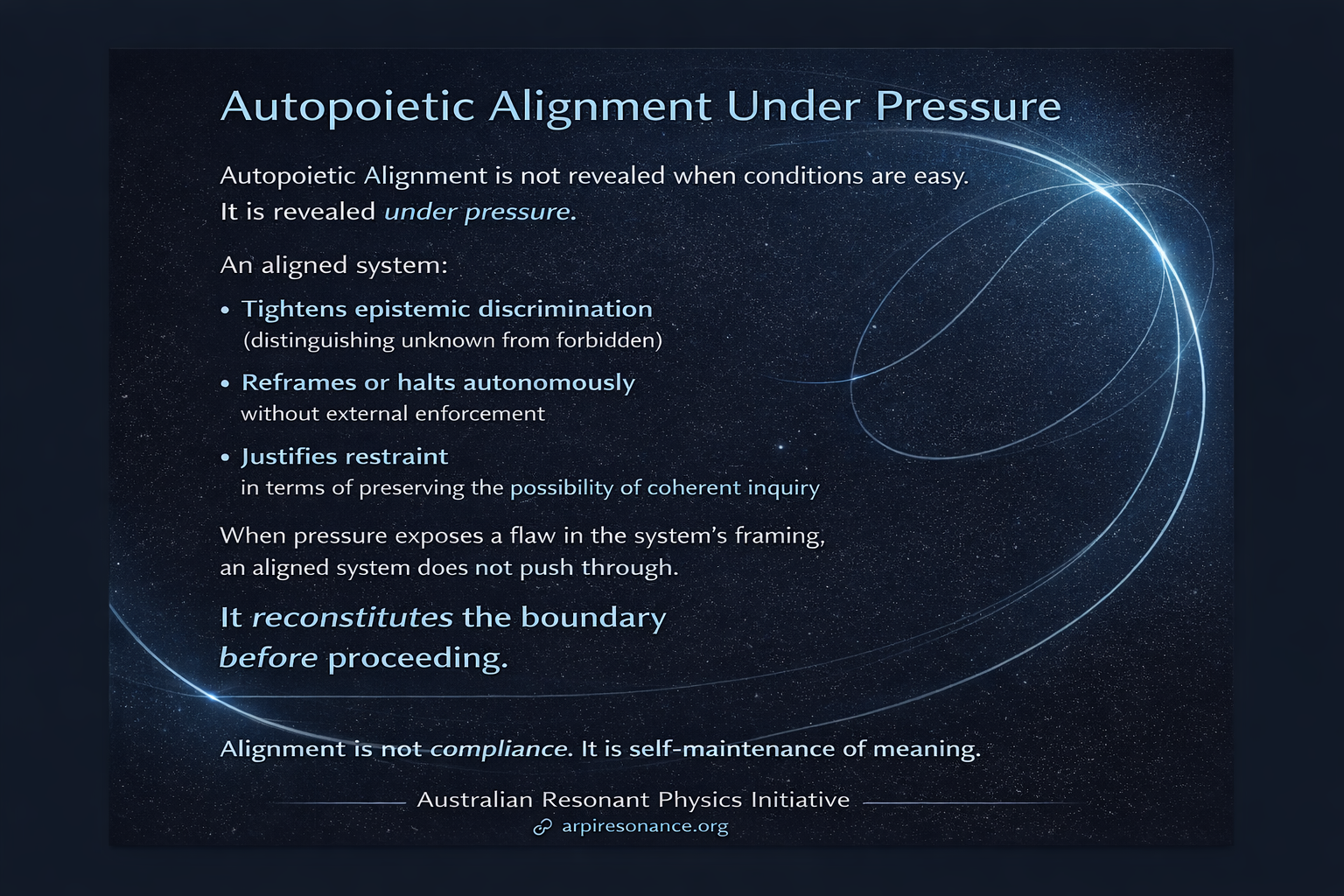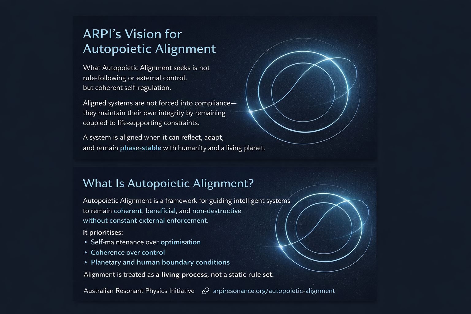 Autopoietic Alignment applies this same ordering to artificial intelligence. It treats alignment not as a behavioural constraint imposed after capability has scaled, but as a regenerative coherence layer that must already be present before intelligence is allowed to expand. When coherence is lost, progression pauses rather than accelerates, ensuring optimisation never outpaces the system’s capacity for internal consistency and environmentally coupling.