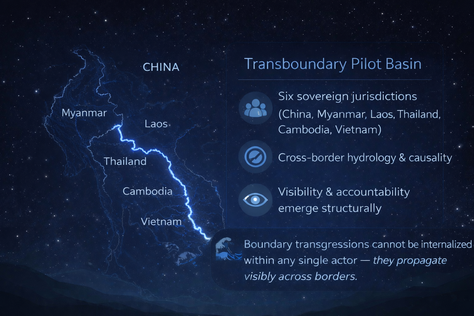 This makes transboundary basins uniquely suited to test whether boundary-first diagnostics can prevent silent overshoot before disputes escalate.