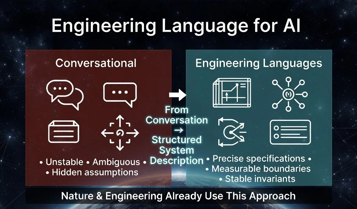 Engineers rarely rely on conversational language to build complex systems. Instead they use diagrams, specifications, constraints, and measurable relationships.