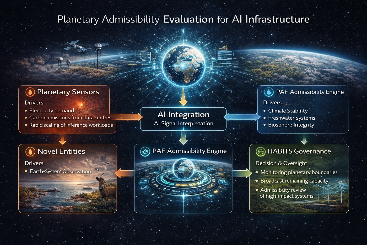 The Planetary Admissibility Framework evaluates these signals against core planetary invariants, including climate stability, freshwater systems, biosphere integrity, land-system stability, and novel entities.