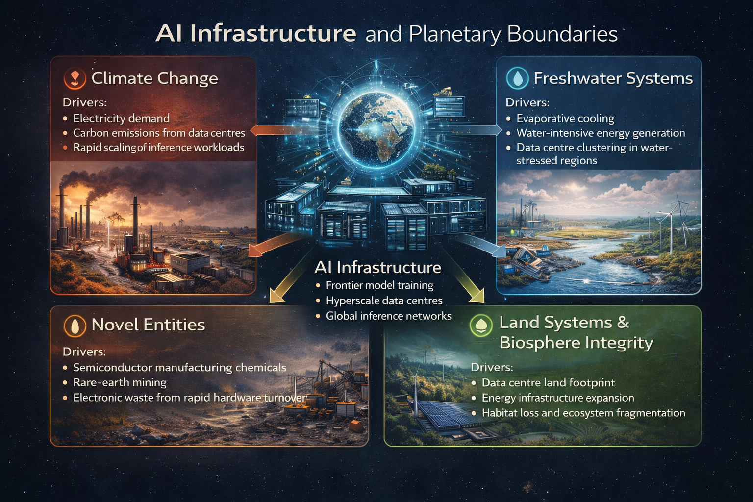 Frontier model training, hyperscale data centres, and global inference networks require significant energy, water, land, and material resources. These demands create measurable pressures across several Earth system processes.