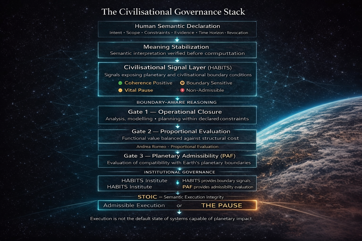 The staged evaluation gates shown in this governance stack (Operational Closure, Proportional Evaluation, and Planetary Admissibility) reflect structural insights developed through discussions with Andrea Romeo, particularly regarding the use of layered evaluation gates for assessing complex technological systems prior to deployment.